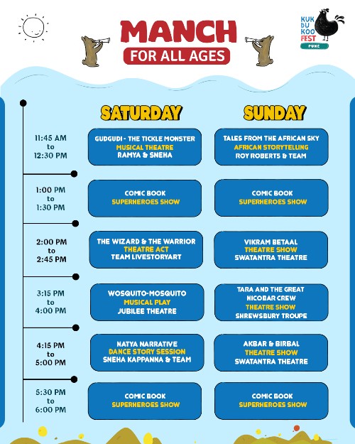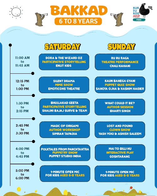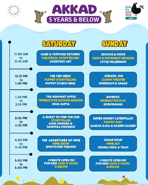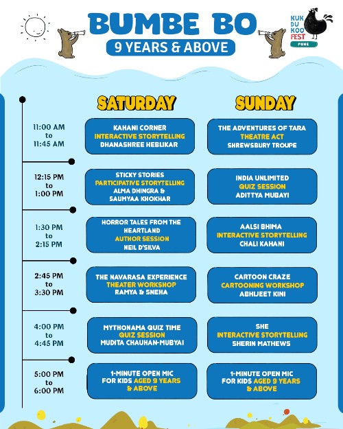 Entry the festival is chargeable for kids if accompanied by parents/guardians. The ticket allows a child and upto two parents to enter all the sessions, shows, performances, and workshops happening across stages. Any products purchased from the Book Fair, Kukdukoo Haat, Food Court, and DIY Zone will be chargeable by the respective vendor/brand.